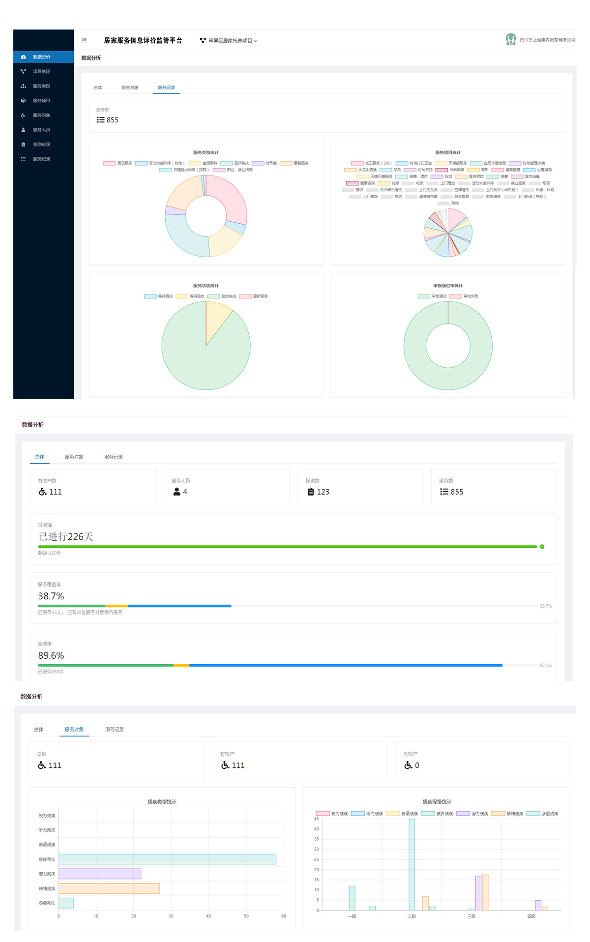 岳之恒居家服务信息监管平台采用信息化的手段对服务流程实施标准化监督管理,保证流程的计划性与真实性,智能化和无纸化操作,也帮助服务机构有效提高服务效率,降低服务成本,同时数据化分析,也将服务工作的过程和结果精准客观的总结展示。